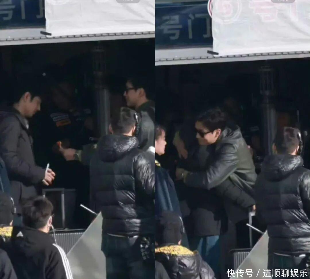 肖战因为低着头,被王彦霖直接一个侧身环抱推着肖战往前走!再接着看!下图是在车站送别刘铮亮的戏份!